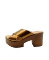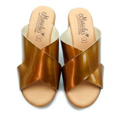 Sandalias de cuero para mujer. Presentan corte en color bronce con la pala cruzada ancha. Tacón de 8,5cm de altura con una plataforma de 3 cm. Fabricadas en España con materiales de origen nacional.